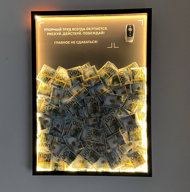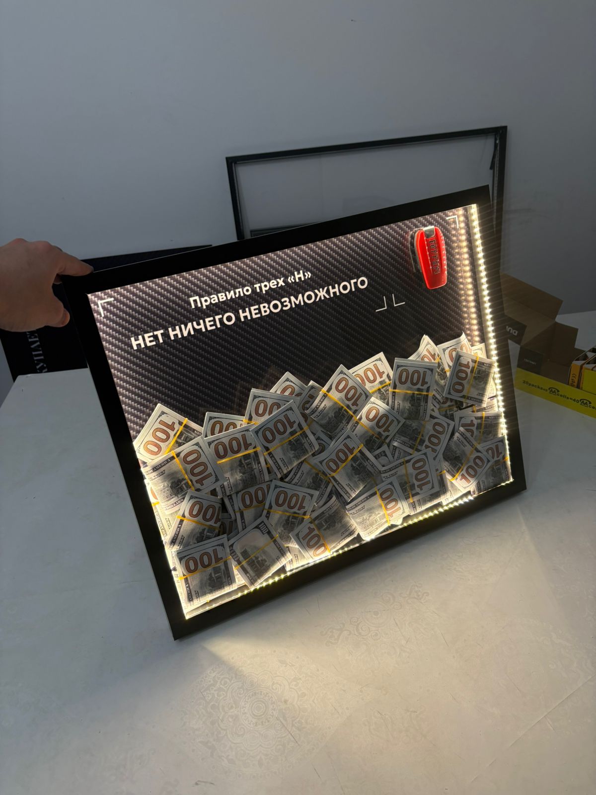 В картину встроен батарейный блок, никаких проводов и вилки не болтается. Плюс освещение включается небольшим дистанционным пультом с выбором различных режимов пульсации и яркости